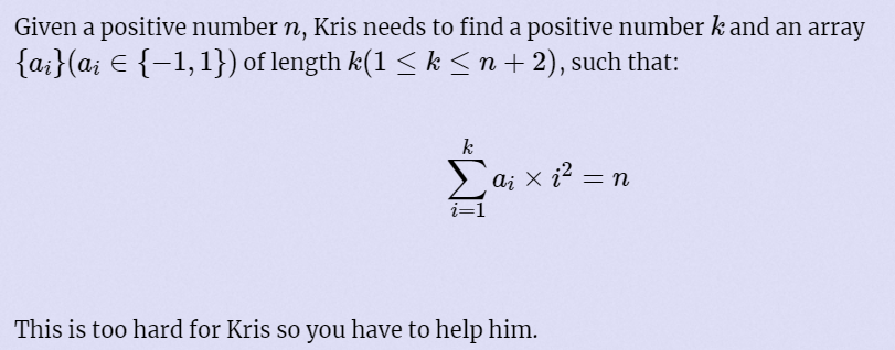 当时想到了平方差凑数,可惜差一步。不难发现,x方-(x+1)方-(x+2)方+(x+3)方=4;那么我们直接让n%4,接下来只要凑出0,1,2,3即可,0不用考虑,1的话就是1方,2的话就是4方-3方-2方-1方,3的话就是2方-1方。于是我们就可以凑出n了。注意到这里k最大为n+2,不过我们按照这个方法凑出来的刚好最大长度也是n+2。